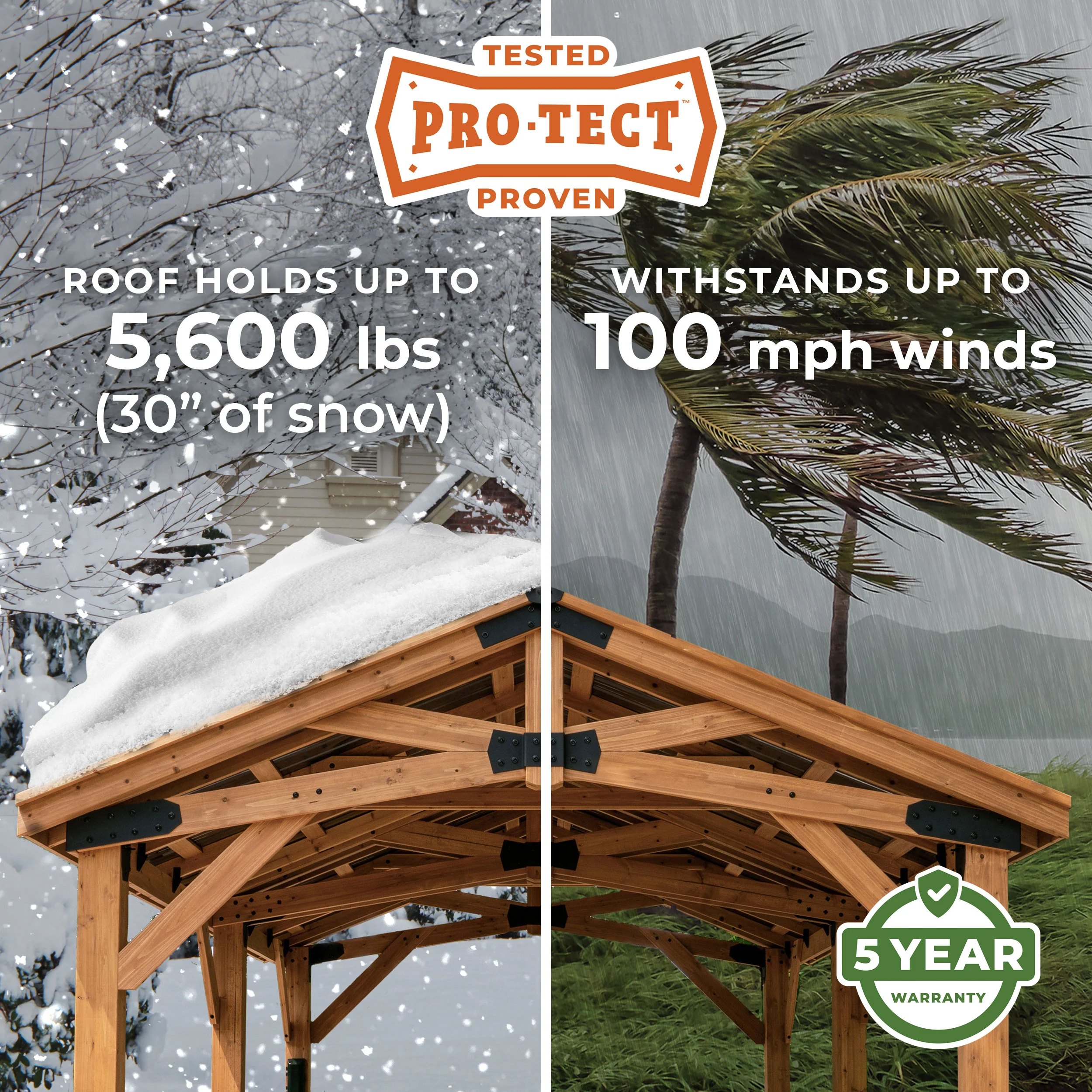 The Backyard Discovery Norwood Gazebo combines beautiful style with modern comfort. Expertly crafted from high-quality 100% cedar, this wooden gazebo delivers elegant style and natural durability. The Norwood stands as a Pro-Tect™ tested and proven structure, engineered to withstand up to 5,600 pounds of roof weight and wind speeds up to 100 mph* providing resilience through every season. Its strong, 29-gauge galvanized steel roof offers superior protection against corrosion and dents for lasting durability. Adorned with black steel accents, the gazebo's peak roof design adds a sophisticated look while providing plenty of shade and protection from inclement weather. The versatile design offers the ideal setting for elevating your outdoor living. From relaxing with a cup of coffee to entertaining guests, this backyard gazebo adapts to any occasion. Our exclusive PowerPort™ brings convenience and lets you add a custom touch. It features three electrical outlets and three USB ports to easily connect lighting, play your favorite music, or charge devices. This patio gazebo kit is ready to assemble with pre-cut, pre-drilled, and pre-stained components, while the interactive BILT® app provides step-by-step guidance. Experience outdoor living at its finest with the Norwood Gazebo—where comfort meets timeless style in your own backyard sanctuary.